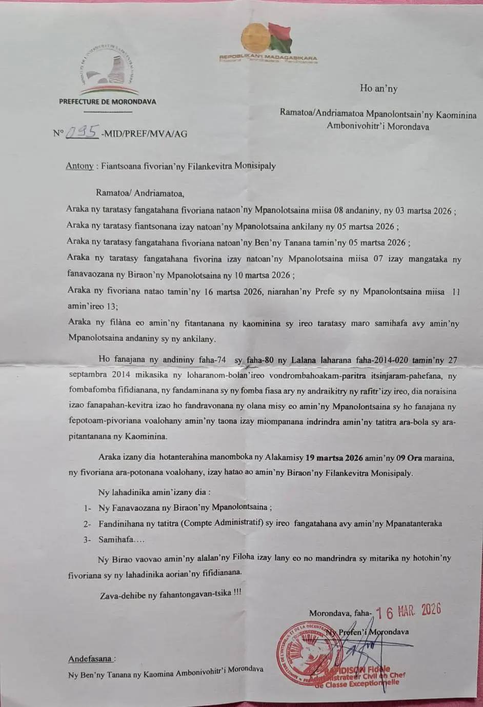Taorian’ny fifanan-tonana sy fifampiresahana maro nifanesy ary fampiantsoana fivoriana maro avy amin’ny mpanolontsaina andaniny sy ankilany tonga teo amin’ny Prefektioran’ny Morondava dia nisy ny fivoriana izay natao tamin’ny Alatsinainy faha 16 Martsa lasa teo izay natao tao amin’ny biraon’ny filankevitraka monisipaly ka tapaka tamin’izany fa hanoy ny asany ireo mpanolontsainan’ny kaominina ary nampiantso fivoriana ara-potoana voalohany amin’ity taona 2026 ity ny Préfet an’i Morondava Rafidison Fidèle izay natomboka androany Alakamisy 19 Martsa 2026 izany.
